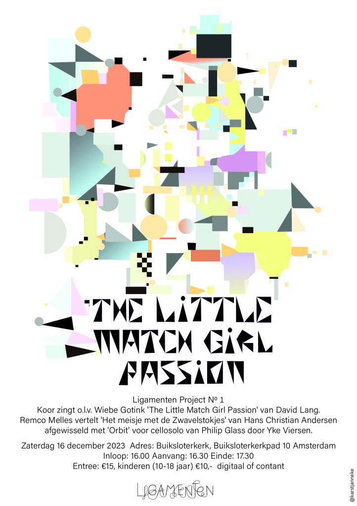 Het eerste project van Stichting Ligamenten omvatte twee uitvoeringen van The Little Matchgirl Passion in 2023, uitgevoerd in de Oranjekerk en de Buiksloterkerk in Amsterdam. Deze hedendaagse compositie uit 2008, geschreven door David Lang voor vierstemmig koor en slagwerk, is gebaseerd op het ontroerende verhaal van Het meisje met de zwavelstokjes van Hans Christian Andersen en geïnspireerd door de Mattheus Passie van Johann Sebastian Bach. Het stuk, dat in 2008 de Pulitzer Prize for Music won, werd uitgevoerd door een vierstemmig koor begeleid door slagwerk.